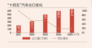 11月,我国汽车出口72.8万辆,环比增长9.3%,同比增长48.5%,为历史上首次超过70万辆;1~11月,汽车出口634.3万辆,同比增长18.7%,全年有望冲击700万辆的历史新高。随着国内市场增速放缓,企业加码出口战略,“不出海就出局”成为共识。